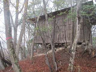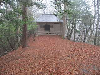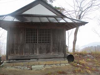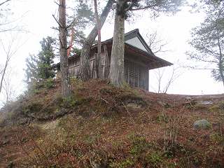 | 1郭南端部にある拝殿。端の半分が地面と接していない。 | 1郭に建つ稲荷神社。脇に土塁がある。 |