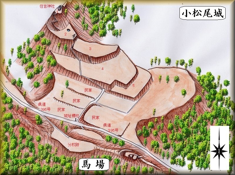 山頂の住吉神社のある郭は非常に狭く、物見櫓を建てられる程度のスペースしかないので、2郭が実質的に小松尾城の主郭であったと思われる。