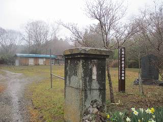 県道沿いのこの位置に城址の入口を示す標柱が立てられている。道路の反対側に集会所があったので、車はそこに停めさせていただいた。