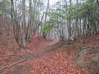 登って行くと、両端に竪堀状の地形がある箇所がある。ここからが城内であろう。それほど明瞭な遺構ではないが、意図的に竪堀を掘った形跡は間違いない。これを城郭と認定する所以である。