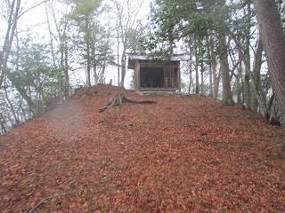 そこから先が1郭ということになる。ただし、けっこうな傾斜地形のままであり、建造物を建てるのは難しそうである。その一番奥の所に稲荷神社の社殿が建てられていた。神社の西側には土塁も見られた。