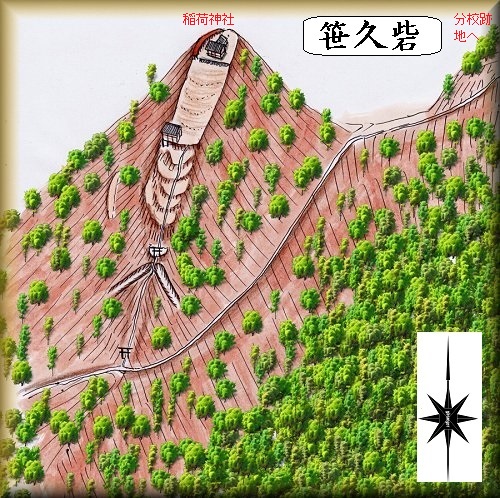 笹久砦は、笹久の集落の西側にそびえている比高60mほどの稲荷神社の祭られている山稜に築かれていた。