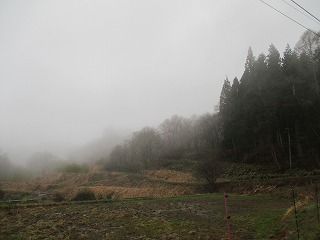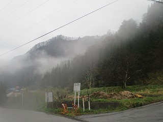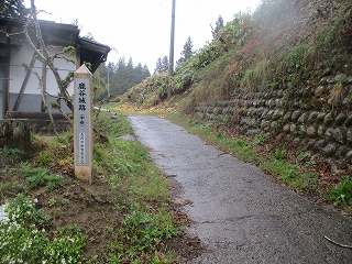 ・・・・ところが道はすぐに未舗装の荒れたものになってしまう。幅も狭い。いくらなんでもこの道を車で進むのは無謀に過ぎる。雨も降っているし、今回は登城をあきらめることにした。