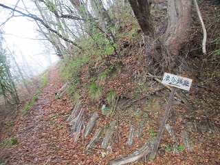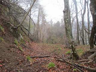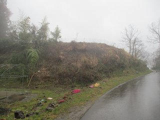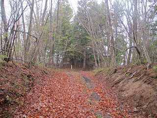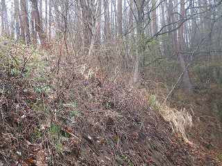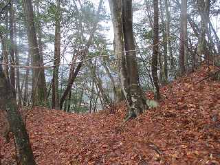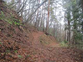 そうすると山の斜面の所で林道は行きどまった。この上がいよいよ城域内である。側面部を這うようにして山道が付けられている。