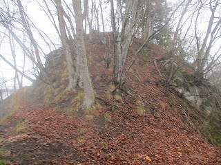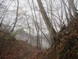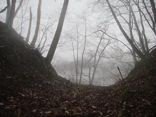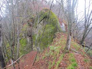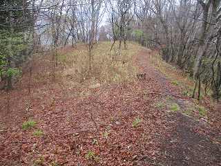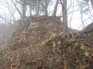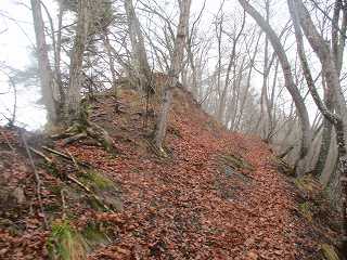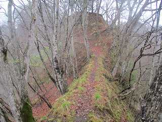 | さらに土橋状に削られた尾根部分。両脇は崖となっており、これを渡るのはかなり怖い。雨の降っている中、傘を差しながら通るのである。風も吹いているよ〜(><) | 3のピーク。正面は岩場となっている。 |