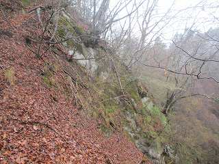 | 1郭から見おろす西側の2郭との間の堀切。 | 1郭南側下の岩場を覗き込んでみる。落ちたらひとたまりもない。 |