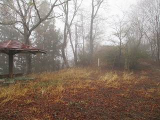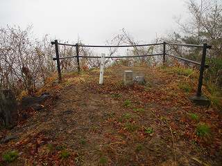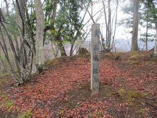 その先に見えてくるピークがやっと1郭である。1郭は高くなっており、左側に回り込んで上がって行くようになっている。この通路の真下は一枚岩のようになっており、滑り落ちたらイチコロである。ここも傘を差しながら注意深く進んで行く。ここから上がったところが1郭内部で、城址標柱が立てられていた。ただし、面積はそれほどなく、物見の施設を建てたらいっぱいになってしまいそうである。