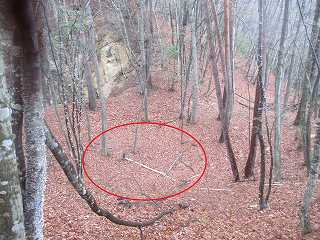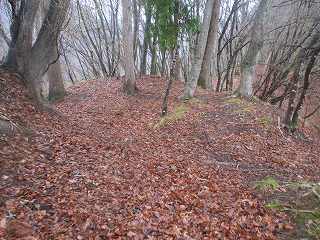 やがて、道が山の方に上がって行く分岐点の所に出た。この辺りの場所である。これを左側に登って行く。上がるとすぐに竪堀状の地形がみられた。城郭遺構なのかどうか不明だが、いかにも城郭遺構のように見える地形である。城から離れた登山道に、このような地形がみられることは時々ある。