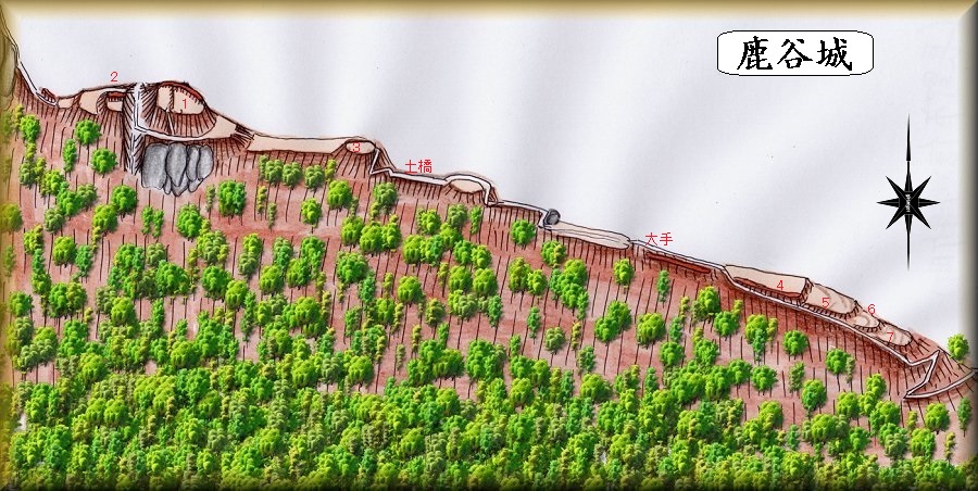 鹿谷城は急峻な地形にあるだけあってまさに天然の要害と言ってもいい山城である。だた基本的に細尾根上に築かれているために、居住用のスペースはほとんど確保てきていない。攻めるのは大変だが、たいした人数が籠城することもできなかったであろう。