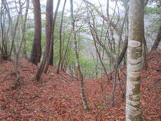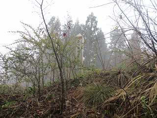 この下には堀切があるらしいのだが、ヤブになっており、雨の中では確認はできなかった。