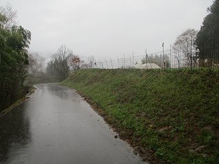 山道をずっと進んで行く。城址はこの左側の上なので、どこから取り付いてもすぐに城内に到達できるかと思われる。とはいえ雨が降っているので素直に道を進んで行くことにする。