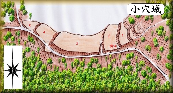 城の位置と構造からして、小穴城が尾根上を通る街道を抑えるための施設であったことは明らかである。それのみを主眼としており、山頂部分まで加工する必要性は感じなかったのであろう。