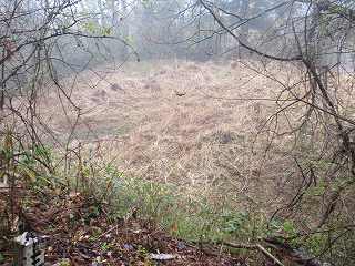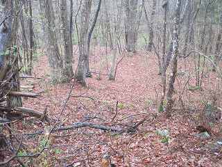 | 同じく東尾根堀切の2本目。 | 山麓の竪堀状地形のところまで戻ってきた。この辺りの方がよほど遺構らしく見えてしまう。 |