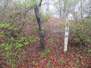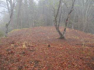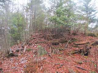 そのまま山道を進んで行くと、その先が峠の鞍部のようになっているところまでやってきた。その手前がピークになっていたので、そこに登ってみる。しかし、そこには何もなかった。鳥瞰図の一番上の部分である。実際の城址はこの先の南側の山稜のようだ。そこでいったん南側の鞍部に降って行く。