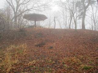 この上が主郭部で、1と2の2段に分かれている。1の部分には東屋が建てられ、ここに「本丸跡」の標柱が立てられていた。