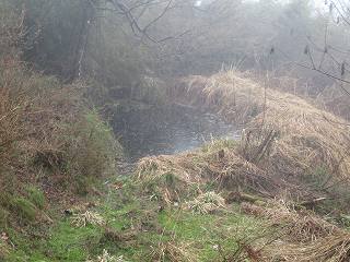 | すると見事な竪堀状地形が見えてくるのだが、遺構なのかどうかは不明である。 | 北側下の穴倉状の地形。天水溜であろうか。 |