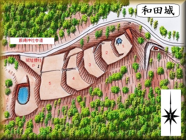 和田城は、斜面上に段郭を造成しただけの単純な構造の城郭であるが、切岸構造はしっかりとしており平場もよく造成されている。何よりもヤブが刈られており、散策しやすくなっているのがうれしいところである。雨の中でも普通に歩くことができた。