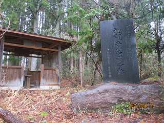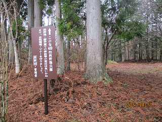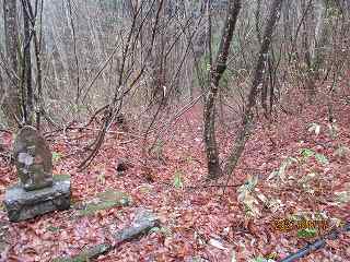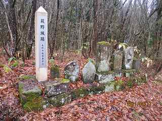 この部分から南西側に尾根を降って行く。すると鞍部の平場の所に出た。ここにはいくつかの墓石が建てられており、その中に萩野城の城址標柱も建てられていた。この辺りを城の中心と考えたのであろうか。それにしても鞍部なので、とても城の中心部であったとは考えられない場所である。