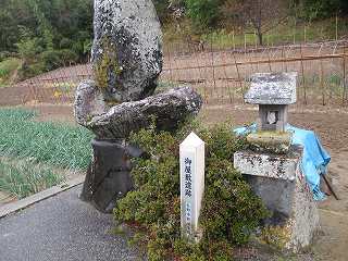 | 中央の鞍部にある墓の脇に建てられている城址標柱。 | 南側の切通し。 |