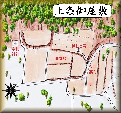 上条御屋敷は、上条の宝鏡神社の東方一帯にあった。現状では明確な遺構には欠けているが、東側には「←上条御屋敷跡」と書かれた案内表示があり、そこから進んで行った所に石碑と祠が祭られており、前面に城址標柱も建てられている。その部分、あるいはその下の平場が屋敷跡だったのであろう。
