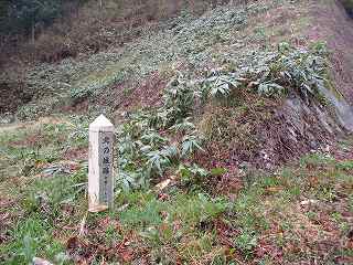 | 北東側の切通し部分。 | 林道の合流点にある城址標柱。 |