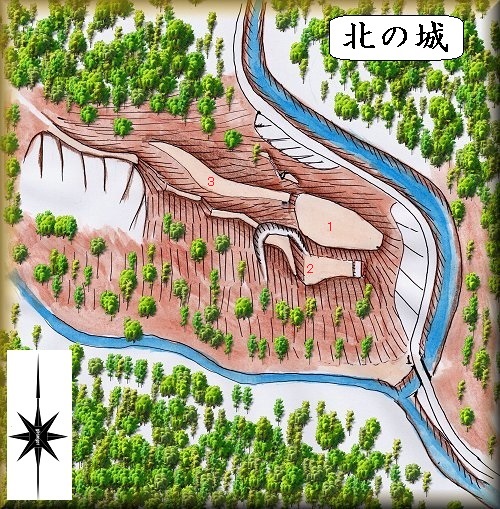 参考までに、『信濃の山城と館A』の図をを基にした鳥瞰図を掲示しておく。主郭部を中心に、尾根上を削平し、いくつかの郭を配置した山城であるが、尾根上は狭隘であるため、実質的に居住性の刈る郭は主郭部分だけだったようである。
