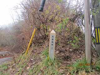 ちゃんとした道はないようで、城址に登るには、標柱がある所か、東側の山稜先端部分からよじ登るしかなさそうである。標柱のあるところには路肩に余裕があるので、車を停めて置いてもよさそうである。