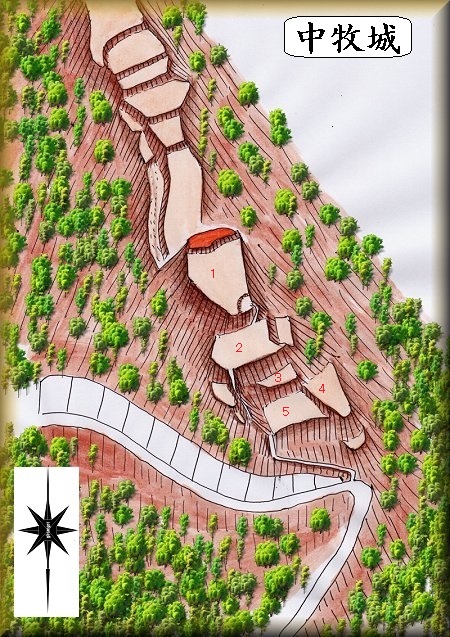 中牧城は清水寺の西方300m、県道12号線が大きくヘアピンカーブをしている地点の南側にそびえる比高50mほどの山稜に築かれていた。