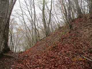 | 堀切側面部。 | 堀底から見る1郭城塁。 |