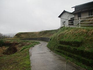 | コンクリート擁壁に付けられた道。ここから上がることができる。 | 上がったところにある土橋状地形。 |