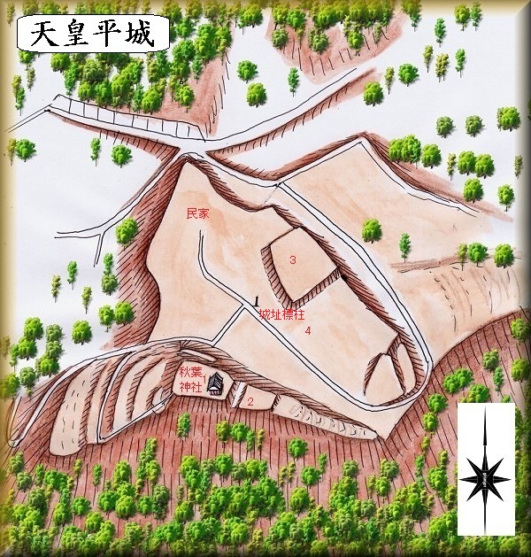 天皇平城は、南側の小さな山城と、その下の広大な台地とによって構成された城郭である。ざっと見たところ山城と根古屋のセットとも思われる形態だが、台地区画の明瞭なことと比べて、山城部分の遺構が微妙すぎる。
