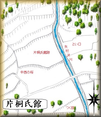 片桐の3807番地辺りが片桐氏の館跡である。現在、それらしい遺構を見ることはできないのだが、谷戸部にある平地であり、谷戸式城館のようなものが存在していたのではないかと考えられる。