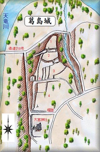 葛島の大宮神社の北側一帯が葛島城の跡である。天竜川が蛇行する地点に突き出した台地上に築かれたもので、台地の周囲の土手は切岸状態となっており、天然の要害というべき場所であった。