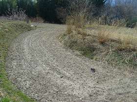 あら城は、飯沼集落センターの南東300mほどのところにある比高140mほどの山稜に築かれていた。地図を見てみると、城山の西側下の台地あたりまで道路が付けられているのが分かる。ということで、この道路を探して進んで行った。