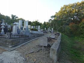 | 西側の山麓から見あげる安源寺城。ここからの比高は40mほどある。 | 3郭にある墓地。 |