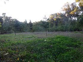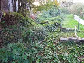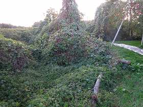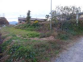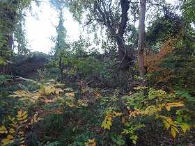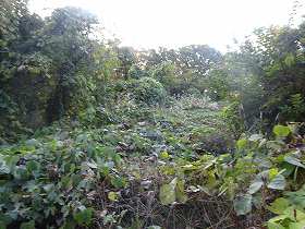 | 北側にわずかに残る堀も、だいぶ埋まってしまっている。 | 北西側の堀が折れている部分。ヤブだ・・・。 |