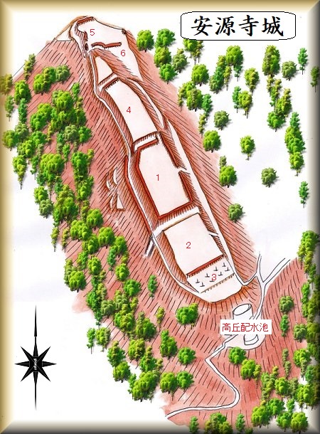 安源寺の高丘配水池の北側一帯が安源寺城の跡である。比高40mほどの南北に長い台地である。