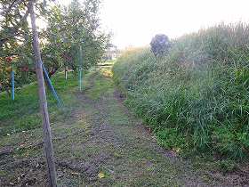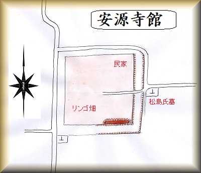 松島果樹園の西側のリンゴ畑が安源寺館の跡である。現状では、長い間の耕作によって遺構のほとんどが破壊されてしまっているのだが、それでも東側の城塁と堀跡らしき名残はかろうじて知ることができる。