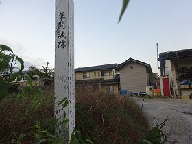 ただ、中央東寄りのお宅の入口に「草間城跡」と書かれた城址標柱が立てられているので、ここが城址であったことをかろうじて確認することができる。遺構があまりなくとも、このように城址を示してくれるものがあると、なんだか安心する。