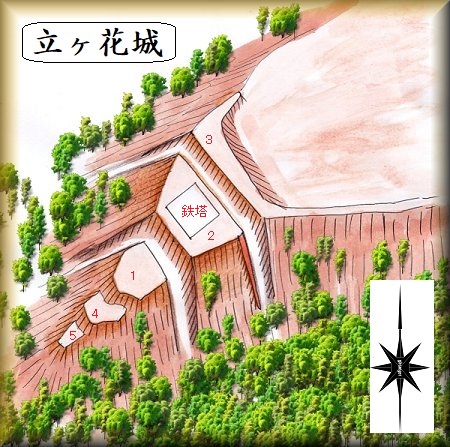 「立ヶ花」とは、ちょっとおしゃれな漢字を充てたものだが、おそらくこれは「館ヶ鼻」を意味するものであると想定できる。要するに館のあった台地縁部といった意味であり、城館そのものを示す名称である。往時はもっと別の名前で呼ばれていたに違いない。