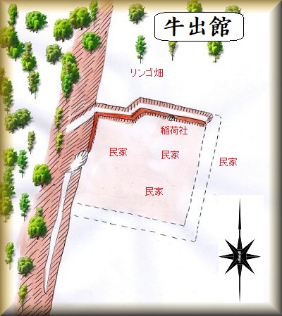 有限会社アサヒデンソーという会社のある一帯が牛出館の跡である。周囲はリンゴ畑となっており、また館内部は左記の会社や民家が建て込んでいるために、遺構の多くは失われてしまったようだ。