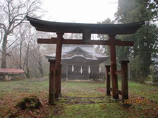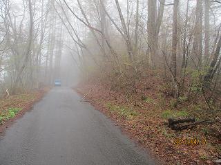 この日、雨が降っているうえに夕方近くになってしまった。車で神社まで行けるようなら行ってみようと思って、林道を進んで行ったのだが、途中から輪留めがしてあり、上まで車で行くことはできないようになっていた。ただし、輪留めの少し前の辺りは道路幅が広くなっているので、そこまで行って車を駐車しておくことが可能である。