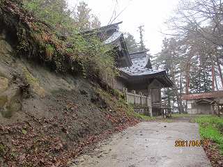 この北側の部分に神社に接続する舗装車道が付けられていた。この道路は新しいものなのか、地形図にも掲載されていなかったので、現地に来てみて初めてその存在を知った。登り口がどこであるのか確認してはいないのだが、この道路を使えば、神社の境内まで車でアクセスすることが可能となっている。