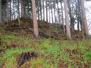 一番高い所が1郭で、西側には土塁が盛られている。また西側には2段のテラス状の郭があり、こうした構造からすると、西側からの防御を意識した構造であったように思われる。