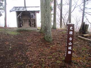 その先を上がって行くと1郭に到達する。1郭には小さな神社があり、またここに「古山城址」の城址標柱が立てられていた。