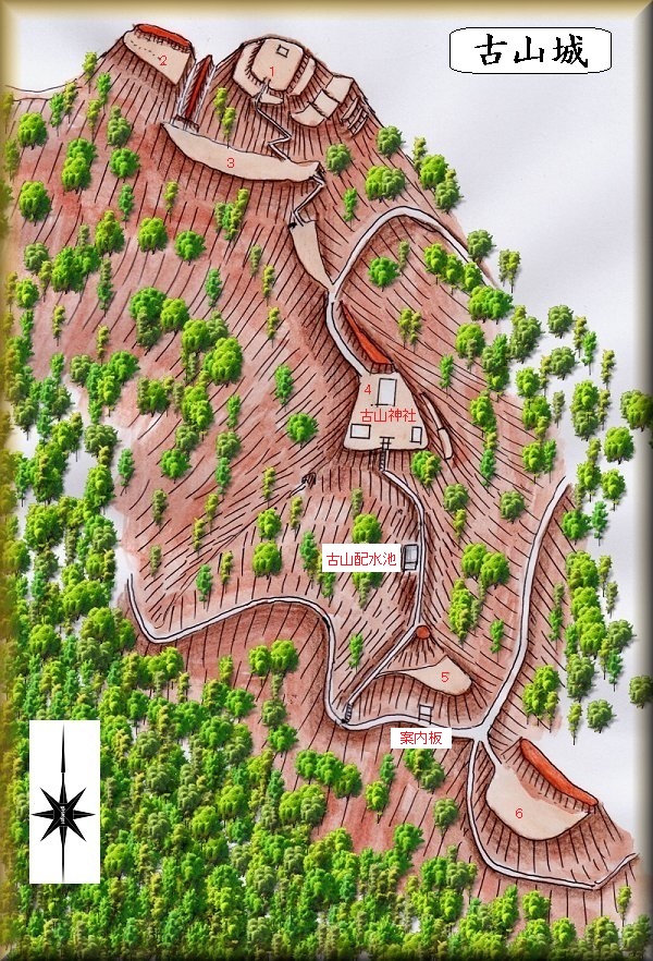尾根伝いの坂道であるが意外ときつい。この途中に古山配水池がある。その先に石段があり、登ったところが古山神社の境内である。ここは4郭とも言うべきところで、さらに北側に進んで行くと尾根伝いに城の主要部にアクセスするようになっている。