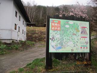 | 南側から遠望する飯縄山。ここからの比高は250mほどある。 | 林道入口にある看板。 |