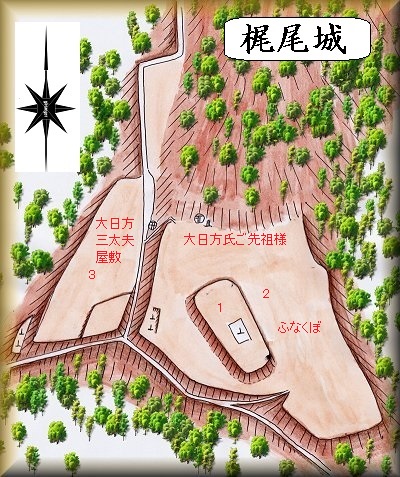梶尾城は、大日方一族であった大日方三太夫の居城であったとする。三太夫の屋敷跡と呼ばれているところは3の部分であるが、実際の主要部は1の部分であり、この伝承については再検討を要するかもしれない。