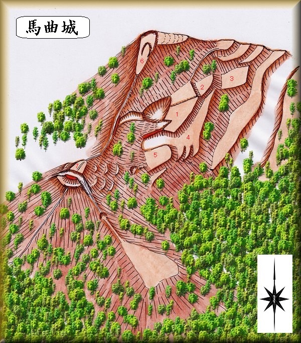 馬曲城は、比高200mほどもある馬曲の集落の上の山に築かれており、googlemapにも掲載されている。