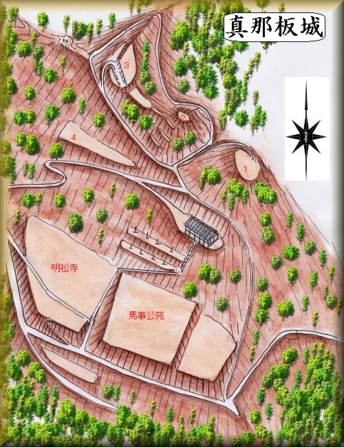 今回、時間がなかったことと、遺構もそれほど見ごたえがななさそうであるので、おそらくこの城に来ることはないと思う。ただ、参考までに『信濃の山城と館A』の図を基にした鳥瞰図だけ掲示しておく。